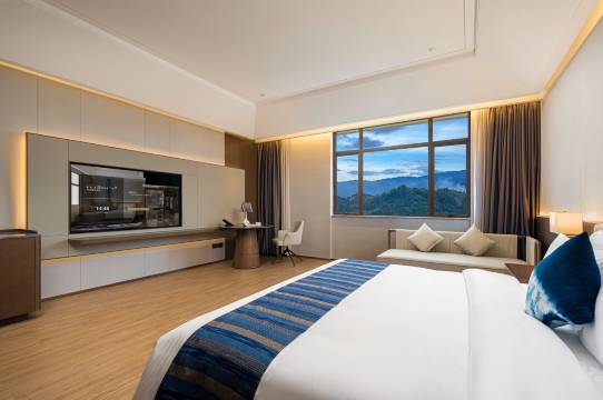 大堂气派有特色,房间很大空调给力,住着很舒服;停车方便,河对面是村超,走路五分钟。还送了水果,两份儿童早餐,县城里很不错的酒店。