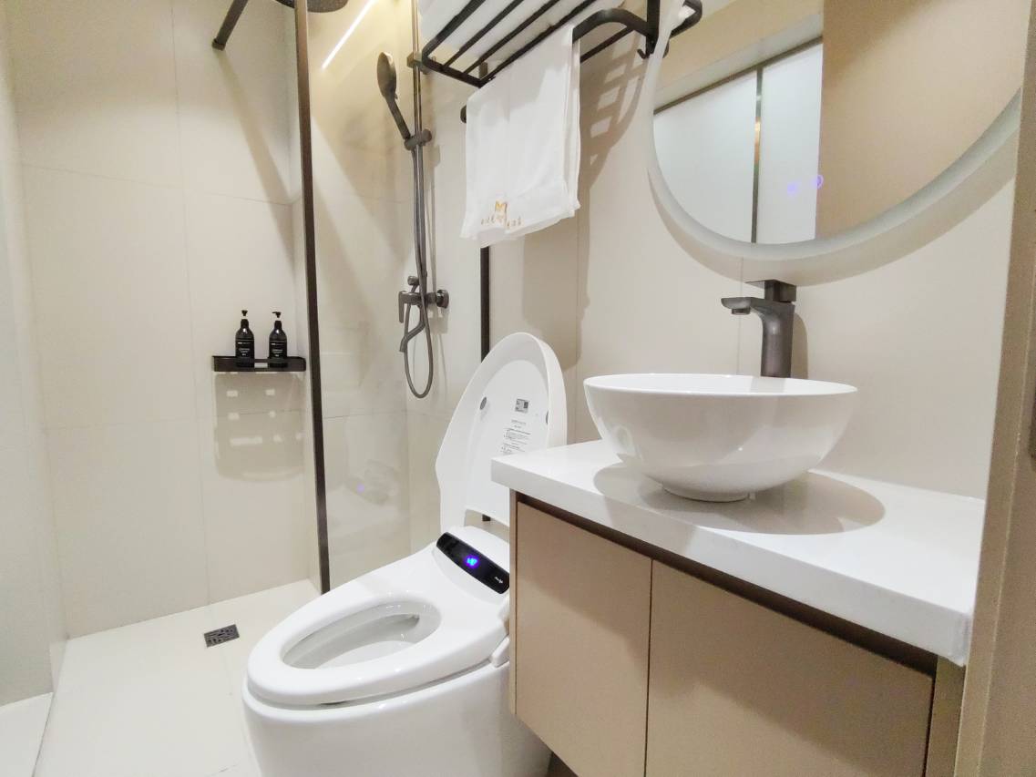 🛋 客房延续了极简与自然的平衡,原木地板踩起来暖洋洋,黑白搭配的卫浴干净得像直接住进了杂志 📖 位置超方便!楼下就有便利店和药店;