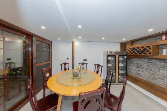 刚到门口,就被那座雕梁画栋的中式门头惊艳到了。暖黄灯光映着朱红灯笼,仿佛一秒穿越回了江南旧梦。走进庭院更是别有洞天,白墙黛瓦上的水墨壁画意境悠远,假山绿植错落有致,搭配着藤编座椅和暖光灯带,夜晚坐在院子里喝茶聊天,整个人都松弛下来。