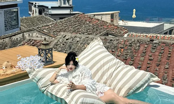 我们定的房间叫“摇光”,还问了一嘴名字的来由,没想到居然是出自“北斗七星”,老板还怪有巧思的!房间窗户旁边就是游泳池,连着大海,整个就是双倍蓝色,喜蓝人谁懂!于是打算在房间里休整休整,和小伙伴哐哐拍照出图。在管家小姐姐的推荐下,我们选择了先去镜沙和长江澳,因为这两个景点离民宿特别近,骑着小电驴十分钟左右就可以到达打卡!
