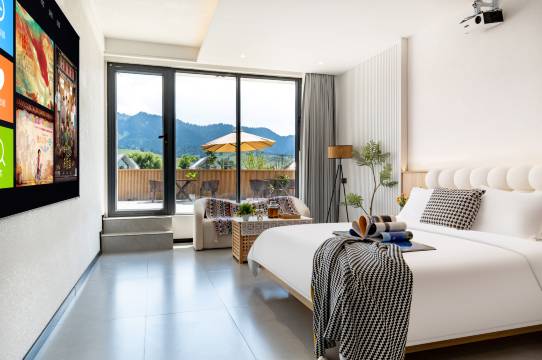 房间非常非常干净,设计风格我也很喜欢。孩子老人来玩都非常适合,睡的也很舒服,还送了下午茶和小礼品,以后朋友来我一定会推荐的,真的超级超级好,晚上还有篝火晚会,玩的很嗨
