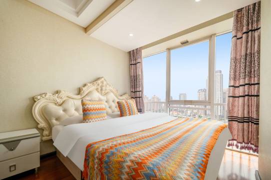 房间干净整洁,就在星海广场边上,我们住的11层,可以在屋里看到跨海大桥,整个星海广场,晚上还可以看到完整的喷泉表演,去浴场海边非常方便,有充足的停车位,父母特别满意