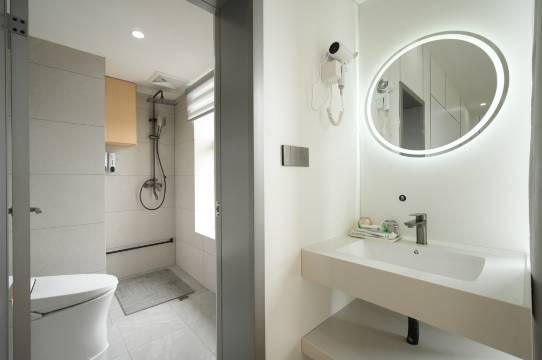 下雨天雾蒙蒙的,卫生间干湿分离做得很好,洗漱用品都是独立包装用着放心,性价比真的超级高,这个价位能住到江景+投影和这么舒服的床,服务态度也很好,下次来这个城市还会选择这家。