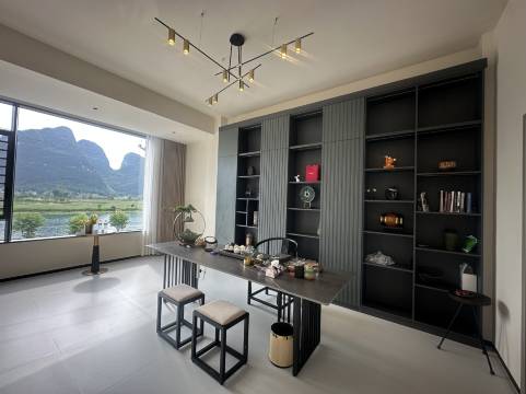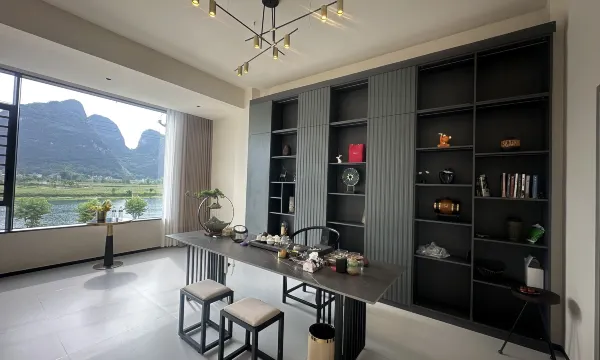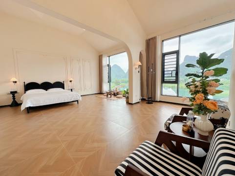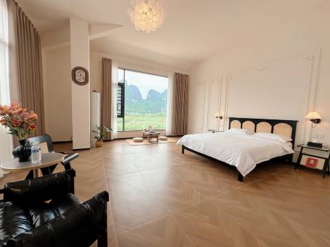 民宿坐落在喀斯特群山与地苏河旁,推窗即是水墨画般的山水,晨起云雾缭绕,傍晚夕阳染红河面,每一帧都像电影画面!尤其是房间的落地窗设计,躺在床上就能看星空,简直太治愈了~