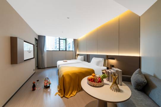 第一次过来这边住 太可以了前台有免费的小零食吃 和咖啡 房间很大 干净 全屋智能语音控制 还有小度机器人送物 投影仪很高清 关键是可以免费停车和开发票 最适合我们这些出差的过来住的。