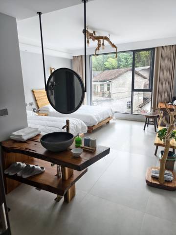 位置在大漈中心,落地窗正对时思寺。非常干净,设施齐全现代,有智能马桶电动窗帘电子门禁。老板娘很勤劳热情,男主人厚道,房间里的木工装饰是他自己打造。床品也很舒服,唯一不足是网络电视有时稍微卡,提出后老板娘马山叫人来查看。吃的都是自己种的蔬菜。作为一个资深旅行者,给于好评推荐。