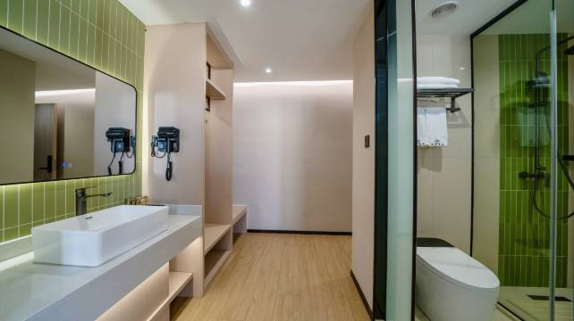 非常满意,刚好在周边有事就选择了这家店,服务员很好要求她们多拿点洗漱用品和纸巾很快就送来了,而且还提醒我楼上有洗衣房和健身房,房间也很宽敞明亮,环境安静舒适