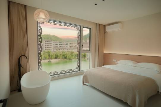 房间更是超出预期,空间特别宽敞,暖调柔光砖搭配原木家具,装修质感十足且很新。卫生做得极其到位,从床品到卫生间都干净整洁,细节处尽显用心。更惊喜的是超大落地窗,把舞阳河和古镇风光直接框成了画,清晨看阳光洒河面,夜晚赏灯火映水波,观景体验绝了。