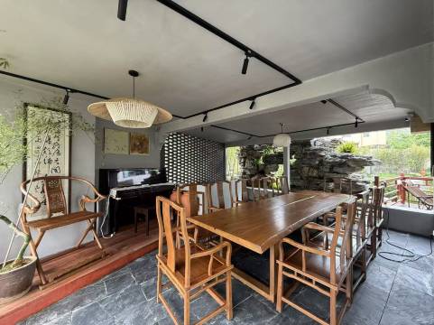 好漂亮的民宿呀,一进门就被吸引了,宋代庭院风格氛围感满满 中式桌椅,特别美,住的房间超大落地窗,窗帘一拉开,满眼都是山景,好像一副山水画一样