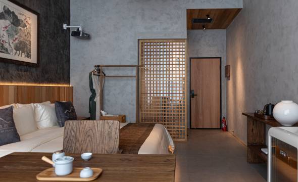 民宿占据了崖州湾南山片区步栈道园区内一片山林之地,取意采菊东篱下,悠然见南山的写意景观。民宿以高端景观园林风建筑为原型,在崖州湾核心的区位打造独体式特色园林景观民宿,用原味的禅修避世风情与园林写意特色的视觉风格配合崖州湾天赋优越自然环境,用东方的韵意之美诠释典雅的诗词画境。民宿私密的地理区位,一条通向南山脚下的阳光大道,带来不被打扰的隐世时光;依山傍水地势,带来山景、公园景、雨林的景观,这里是真正的人间天堂。