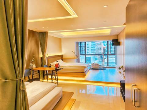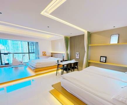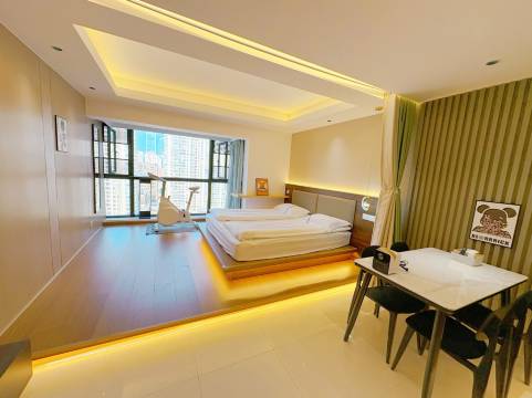 两室一厅的房间布置的温馨雅致 房间干净整洁 投影清晰操作方便,高空观景视野开阔,晚上夜景很棒,推荐家庭出行,朋友结伴,住的安静又舒适。地处市中心 交通便利 楼下拐个弯就到步行街,总之非常满意👍