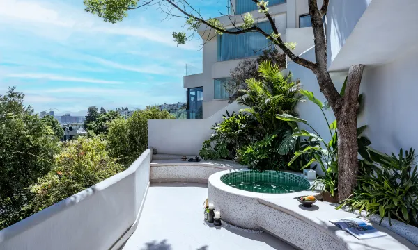 房间阳台花园泡池被绿树环绕,一边泡澡一边欣赏海景,好不乐哉~房间粉红色的布置非常有氛围感,坐在沙发上喝着咖啡☕️非常惬意😌