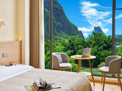 酒店所处在兴坪镇的进口沿街,极容易找,新店各方面施备齐全,干净,去附近用餐方便,去景点有租电动車,超方便,不沿街房能看景色,超值,值得推荐给各位,去阳朔车叫滴滴10元左右,👍👍👍