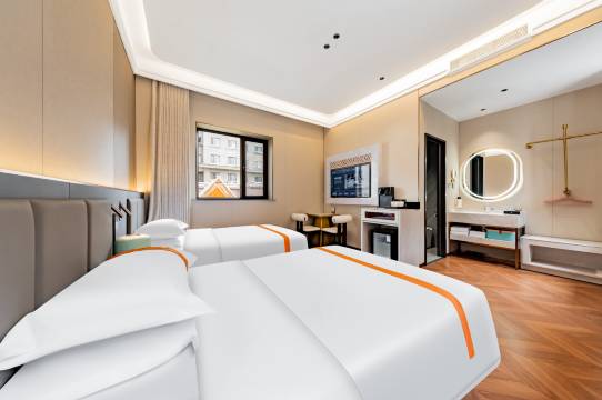 房间很大,住的是两张1.8米床房,非常适合家庭游,枕头床品都特别舒服,酒店环境闹中取静,位置特别好,出门就是小吃街和泽成冰煮羊,十一期间晚上随便吃随便逛可以到11点半,穿过小吃街就是塞上老街,再走走就到大召寺广场,非常便利。