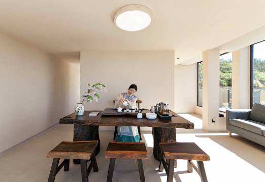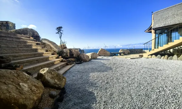 第二天入住的是晚晴,虽然看不到海景,但它的布局和庭院也非常美观,妈妈非常喜欢,住起来舒适又自在。庭院超级有氛围感,在这里拍到的风景视角独特,有石头房做前景,让画面更为丰富。早上还看到了轻微火烧云,真的太美啦!