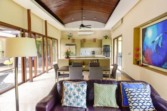 一栋令人叹为观止的私人别墅!这栋定制设计的三卧三卫别墅位于海滨度假胜地 Reserva Conchal,距离业主专属的私人海滩俱乐部仅需三分钟车程(高尔夫球车车程),您可尽享俱乐部所有设施。别墅内部装修精美,处处彰显品质,包括土耳其石灰华地板、大理石盥洗台和石英石厨房台面。别墅的每个角落都融入了赏心悦目的建筑细节,营造出**奢华与放松的氛围。
