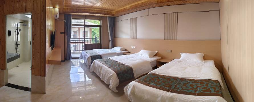 房间干净,三张床都很大,非常适合一家四口出行。阳台晾晒方便。老板人很好,主动接送去景点。
