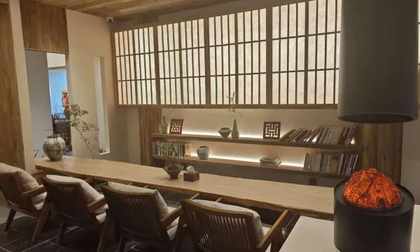 房间设计的很舒服 白天阳光照进来让心情很愉悦 有无线充电 好几种枕头可以选择 智能马桶 洗护的味道很好闻 还有泡脚桶 冬天配备的浴袍比较保暖里面有绒很柔软 提供免费零食水果小冰箱咖啡茶包 房间配备的投影仪也都有会员的 民宿的咖啡店味道很不错也对景区开放