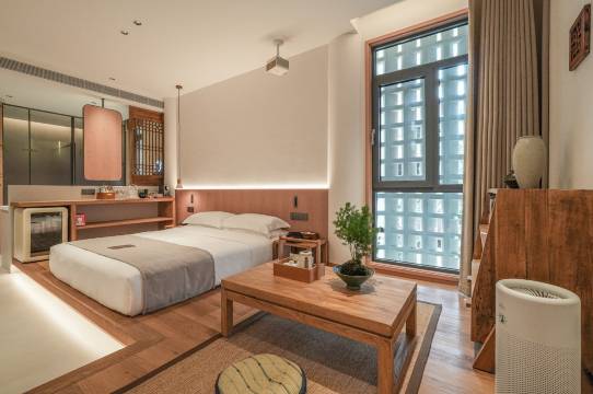 房间细节做得很到位。家具是原木色的,配上棉麻质地的床品,干净又温馨。卫浴备品齐全,还贴心地准备了茶具和本地茶叶,晚上泡一壶茶坐在窗前看老街夜景,氛围感直接拉满。