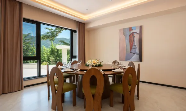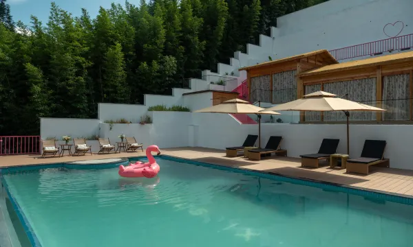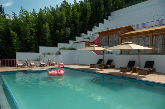 暑假期间带着孩子来山里吸氧 半路上看到这家民宿 进去问了下 竟然是刚装修好的!店内环境非常好,客厅灯光是暖色 房间也是便侘寂风,很温馨,在房间内山景尽收眼底,窗帘和灯光都是智能化,很方便。泳池水很清澈,无边框泳池也太出片了!!!强烈推荐!