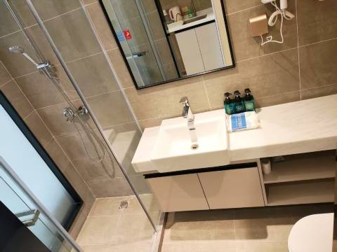 新开的酒店,就在月登阁地铁站旁边,出行方便,,可以线上办理,方便高效快捷,房间宽敞舒适,跟图片一样,干净整洁,有一次性浴巾毛巾马桶垫等物品齐全,房间是大屏投影,还有会员,价格实惠,住的很舒服,性价比很高