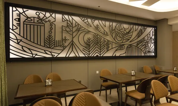 酒店大堂恢弘大气,简约的雕塑,几处线条变勾勒出了驯鹿的模样,酒店内到处挂着各式各样的充满鄂温克民族风情的油画。