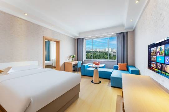 距离市中心5分钟,酒店的服务挺满意的,服务人员工作态度很好,现在小姐姐也耐心解答各种的问题,酒店的环境也很不错,舒适,卫生干净,视野很好,晚上看夜景挺美的,性价比也挺高,楼下还开了24小时的便利店。