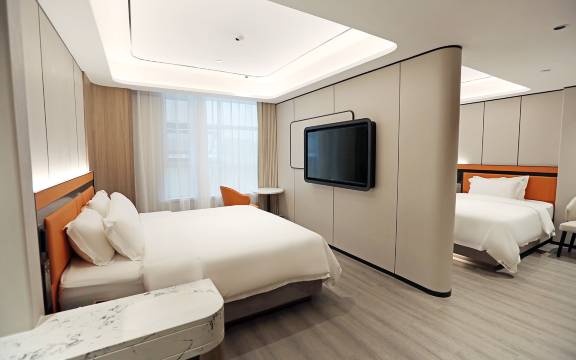房间干净整洁,装修风格现代简约,空间宽敞。床品采用零压床垫,柔软舒适,隔音效果也不错,能让住客享受良好的睡眠体验。