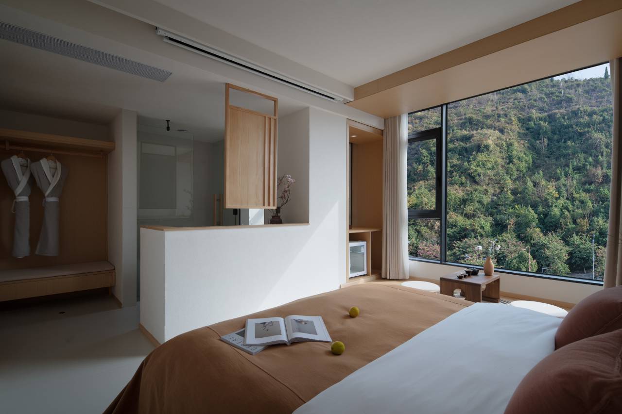 🖼️ 整个民宿是ins轻奢风,融合了非遗画廊的艺术感,真的有种住入美术馆的感觉,公共区域挂满了艺术家的画作,房间是极简原木风,超大落地窗躺床上就能看山景,戴森吹风机、榻榻米、浴缸、大屏投影一应俱全,细节控表示很满意!