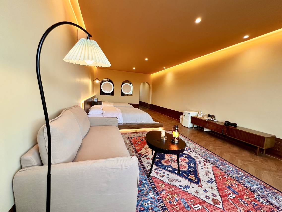 民宿坐落在草原里,整体环境不错,房间里床品都是希尔顿同款,牙膏是意大利进口品牌,能看的出老板用心了,整体给人感觉很幽静,确实是放松的好地方,房间设施都很新,很有质感,算是草原民宿里的天花板了吧