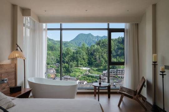 高见·寨顶(SummitTara)位于侗寨制高点,C位无死角赏侗寨人间烟火,每一间房都是180°全景观景房在景区中心,独享山巅,坐拥侗寨全貌,打开窗就是一副侗寨全景图我们背靠竹林,一楼大厅保留了一片山体活背景,人与自然的共生,是侗族文化的内核所有客房和公区均为180°侗寨全景房,有中央智能空调,百度智能系统,九牧顶配智能卫浴设备,徕芬顶配吹风机,乳胶+鸭绒床品大厅露台与竹林露台,夜晚可以赏星看月,还能一起烧烤起舞侗族当地管家也是非遗传承人,在侗寨之巅,邀您尽享蓝调时分的侗族大歌
