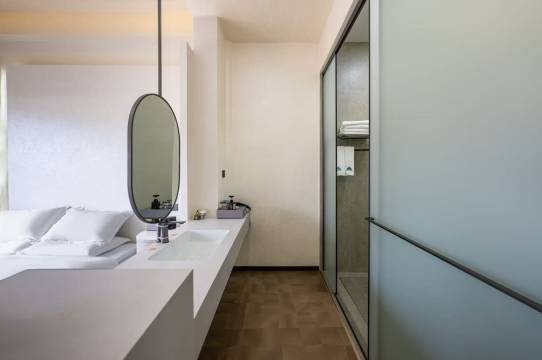 设施贴心,房间有投影、舒适床铺,卫浴干湿分离,公共休息区雅致有设计感🛏️