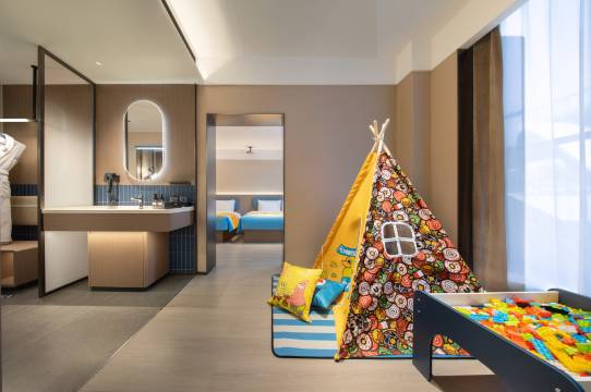 超出预期的入住体验,前台在预订房间没打扫好的情况下为我们升级了家庭房型,虽然没有小孩子但是拐角的小帐篷依旧是非常诱人的存在。第一次见到办理入住时身份证会套上塑料保护壳返还,而床头有直接呼叫前台的按钮等种种细节更体现着酒店对细节的用心。但比起房间设施硬件,最出彩的还是酒店团队,只要出门3楼的客房阿姨就必然会热情地询问是否有物品需要,前台人员每个也都热情而有礼貌。退房的时候一个长的很帅的前台也立刻询问入住的体验和建议,还赠送了一包茶叶感谢意见的沟通。很难想象开业不到一年的酒店,前厅和客房团队能磨合到超过普通五星级的服务质量,感谢优秀的酒店团队能带给人愉悦的入住体验。