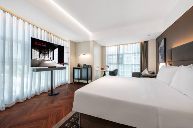 这家酒店超新的,门口地铁站去高铁站就 5 分钟,这次定的豪华大床房,自己一个人住蛮宽敞的,迷你吧饮料很多,大热天回来可以喝到冰镇的,很赞,必须推荐[强]。另外早餐也很美味[色]下次来还会住这家。