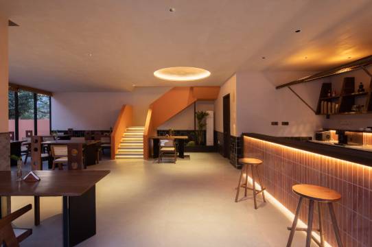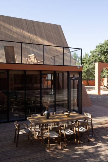 2️⃣民宿大厅是一个很温暖的书房,整栋楼有一种穿越中东的设计感,后院有超大泳池、热气球装置和沙区可以打卡