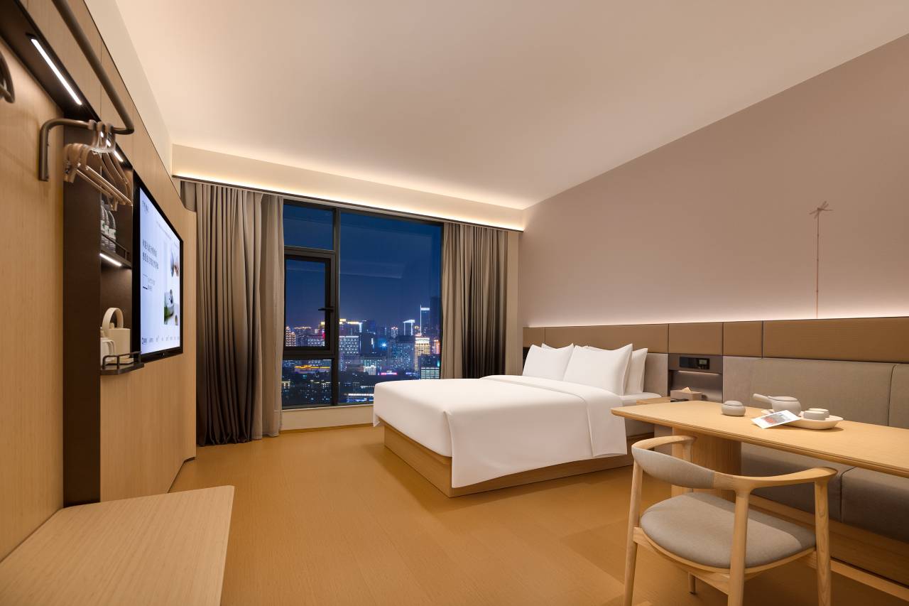 走进大堂,竹木原色简洁明亮,祥茶香氛徐徐沁心),读一本书、常一幅画,让每位旅人在东方美学的留白中、感受平和与松驰,是隐干喧露的城市第三空间。本店始终致力干提供最契合国人审美和生活方式的酒店,把这片土地独有的住宿文化传递给每一位住客,是大众出行的安心之选。