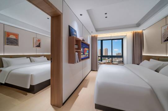 这个行政套房我真心推荐给带小孩,一家人出行或者老板一起出差的朋友,房间很大,办理入住的时候前台小姐姐怕我们热到了很贴心的给我们拿了三瓶水,停车也很方便,房间隔音也很好,不影响睡眠,退房的时候保安叔叔还帮我们搬行李,很体贴,看得出来酒店管理不错,每位员工脸上都洋溢着笑容,有一种回家的感觉。