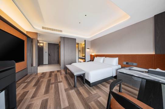 春节过来走亲戚过年,酒店特别满意!从设施,环境,服务,卫生,都很好,入住当晚,本来订的雅闲,前台给免费升级了套房,很是惊喜,毕竟是春节假期。然后发现房间很大,2米大床够三口人,2岁半女儿在床上开心的又蹦又跳的。卫生条件也很好,室内和走廊都设计感满满,住着安静又舒服。特别我要夸一下乳胶枕头,很舒服。早餐也很好,很多样,特别是馄饨,宝宝吃的很香,忘记拍照片了。最后服务也很棒,不管前台小姐姐还是餐厅小哥,都很和善友爱,总之很满意,下次过来继续入住。