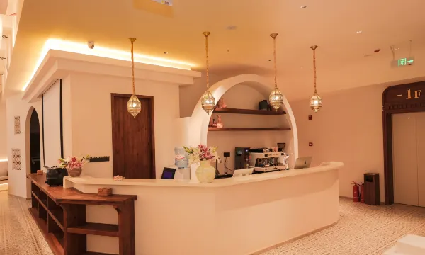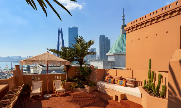 酒店设计感强,装修风格独特,整体氛围温馨且现代。八层露台是观看跨海大桥灯光秀和日出日落的绝佳位置。