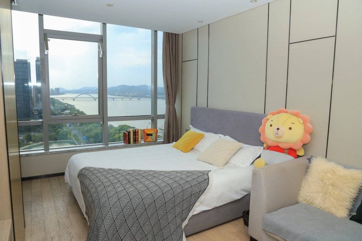 房间的落地窗正对钱塘江,视野绝佳,白天能看到江面上波光粼粼,船只往来,傍晚时分,夕阳洒在江面上,美到失语,晚上对岸灯火璀璨,随手一拍都是大片。房间是现代清新风,很ins,每个角落都很出片 ,住起来舒适又惬意。而且屋内设施一应俱全,还配备了全屋智能,灯光、空调、电视都能轻松调控,超有科技感。
