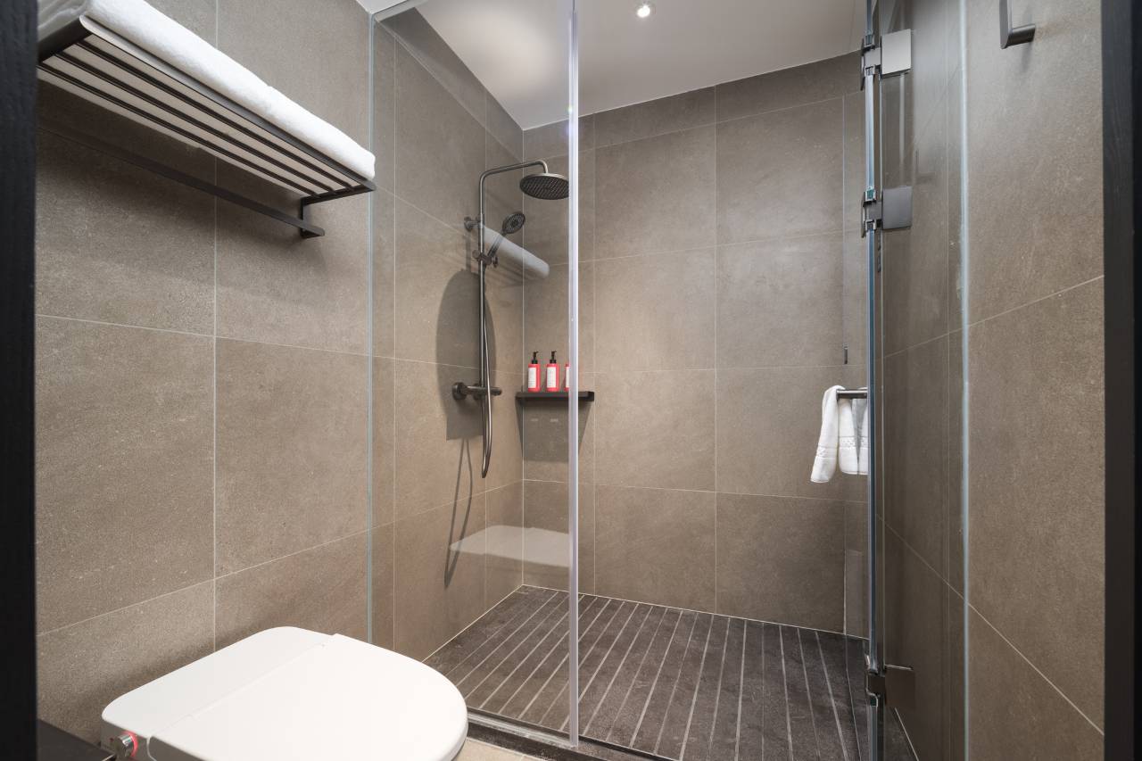其次,房间的设计充满了巧思,极度人性化。 它摒弃了华而不实的装饰,专注于提升居住的舒适与便利。全屋智能控制系统让你可以“动口不动手”,一句语音指令就能操控灯光、窗帘和空调。灯光设计尤其值得称赞,多种照明模式适应不同场景,床下和卫生间的感应灯让你起夜时无需摸索开关。细节处更是见真章:床头充足的USB充电口、书桌旁角度可调的阅读灯、衣柜内置的全身镜、静音效果超好的小冰箱,以及干湿分离、水流充沛的淋浴间,每一处都考虑到了住客的实际使用习惯。隔音墙的设计也非常出色,关上门便是一个静谧的私人空间,能保障一夜深睡。