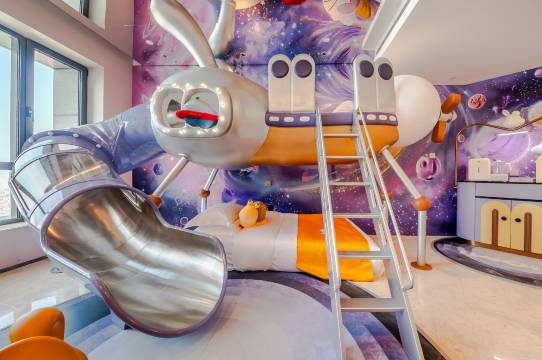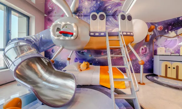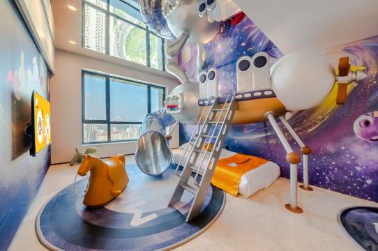 这次出行带着一个老人两个学龄前娃,特地提前做了功课,选择了这家酒店。刚好分别体验了太空萌兔和极光之旅两种房型。萌兔是一房,但是客厅还能有单独一张床。极光是独立两房。两种都有有趣的滑梯,推开门娃就非常惊喜!房间里全是适幼装饰,搭配软包设计的墙面和圆润家具,两个独立卫生间,还有洗衣机,亲子厨房,能满足一家人的出行。配备儿童坐便器、洗手小凳子、热奶器、儿童牙刷、驱蚊液一应俱全,连床围栏和婴儿推车和挖沙工具都能免费借,轻装出行太省心 。