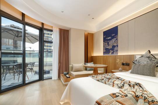 在繁华与宁静的交汇处,遇见心之所向。 本店,于城市河畔优雅启幕。这里,粼粼波光为幕,繁华商脉为邻,坐拥得天独厚的地理位置——信步可达活力四射的永逸生活、购物广场,转身即入河风轻拂的静谧天地。为追求品质与独特体验的您,打造一处融合现代科技与自然诗意的城市绿洲。 智能掌控,悦享自在每一刻,酒店采用全智能客控系统,指尖轻触或语音唤醒,灯光、温度、窗帘尽在掌握。科技无声融入,只为解放您的双手,让入住体验更随心、更便捷、更富未来感。 匠心打造的江景景观房:推窗即揽如画河景,朝闻鸟鸣,暮枕星河,将流动的诗意引入私人空间。惬意露台房、庭院式花园房、温馨的家庭双卧房、商务洽谈带独立式茶室的商务大床房等各类房型。独享一方私人露台,或沐晨光品茗,或邀星月共饮,城市喧嚣之上的静谧时光由此开启。雅致花园房:绿意触手可及,窗外花园景致盎然,让清新自然成为您窗前的常驻风景。 本店,不仅仅是一处下榻之所,更是您探索城市活力与回归心灵宁静的平衡点。我们以智能科技为翼,以河畔美景为伴,以贴心服务为心,期待为您书写一段难忘的紫悦时光。