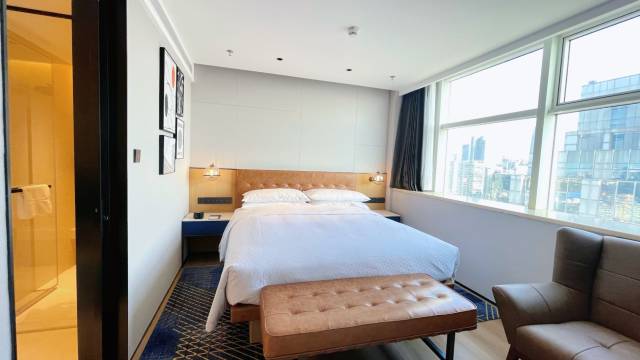 酒店非常新,位置也非常好,一进门礼宾员就热情的打招呼,还会在办理入住时送上暖暖的欢迎茶,办理入住时前台的服务员William也很热情,给我们介绍了周边吃喝玩乐的地方,软件和硬件都可以,作为一家四星级酒店性价比拉满!