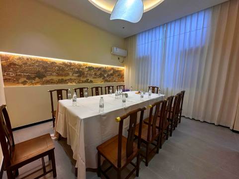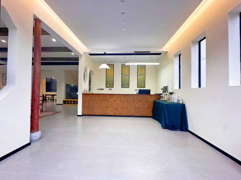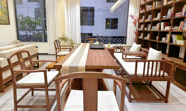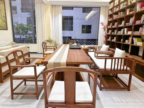 - 公区雅致:进门就被椭圆形窗洞和雅致的盆栽吸引,墙面的山水挂画和满墙书架,瞬间让人静下心来,像走进了一间有温度的书房。