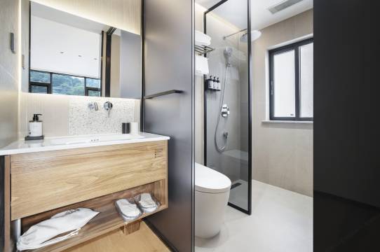进入房间,是藏在风雅下的“现代芯”。智能马桶:温暖的座圈是最大的慰藉;全能“小度”:动动嘴,就能控制全屋灯光、窗帘,电视,空调,播放轻音乐、查询天气。那种“君子动口不动手”的便捷,与古朴的环境竟毫无违和感。