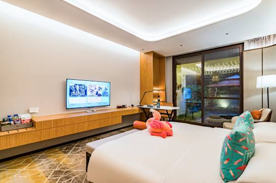 园区整体很好,很适合亲近大自然。接驳车也很到位,每个服务员都很热情,房间床上用品卫生干净,物品齐全,房间地面卫生很仔细,服务态度好。园区设施齐全,电影院,咖啡馆,温泉体验也不错,池子很多,餐食也好吃,能点餐送到房间里,还有烧烤:-)。晚上🈶篝火晚会,氛围很好,很开心!体验很棒,下次还会来体验