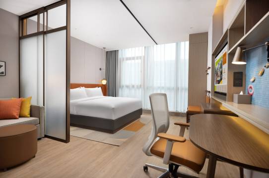 房间很好,很干净,有微波炉和冰箱,设施很方便,酒店的服务人员很亲切友好专业,前台花花服务特别好让人有宾至如归的感觉。早餐很好吃,洗衣房洗衣,烘干:都很方便。是宠物友好酒店,旁边还有宠物友好商场,入住体验非常好。