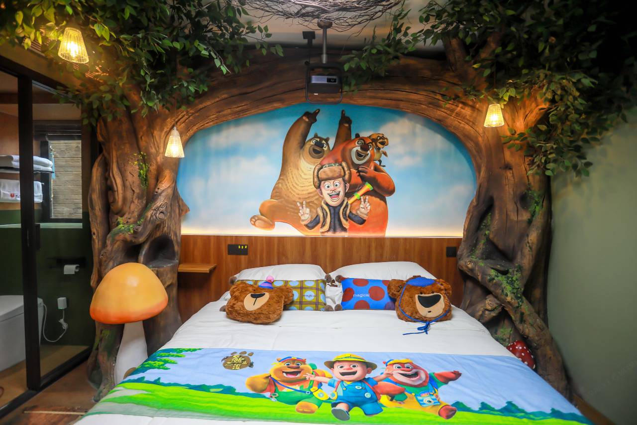 房间布置更是让人惊喜,主题元素满满,从床品到装饰,到处都是熊出没的卡通形象,还有可爱的玩偶,细节做得非常到位。房间设施齐全且干净整洁,住起来很安心。