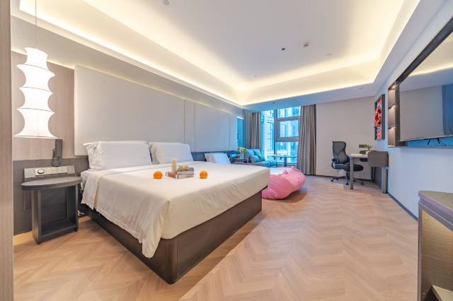 这家酒店位于市中心,地理位置非常的方便,酒店很新,卫生状况也很好。是一家性价比超级高的酒店。晚上很晚到的,但是办理入住的流程非常的顺利。酒店小哥非常善解人意,还给升级了房型。地理位置太好了位于角楼,可以获得270度的视野。夜晚靠在飘窗边喝着小酒看夜景,白天坐在角落的按摩椅上享受按摩,还有什么比这个更惬意的!!这个价格还要什么自行车,超级推荐!!只是酒店里的淋浴设备过于新了,一开始没有研究好被淋了一身。临走时小哥还送了伴手礼,这个酒店的服务流程设计的峰终价值也是坐到位了。